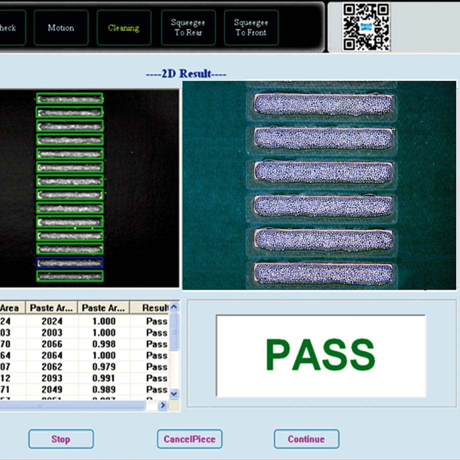 During the printing phase, squeegee pressure is permanently monitored, and any deviation is displayed on the control screen for immediate correction. Each printed board can be 2D inspected to ensure that no deposits are missing, and after each stencil cleaning phase, the stencil itself is 2D inspected to make sure it is valid for production.